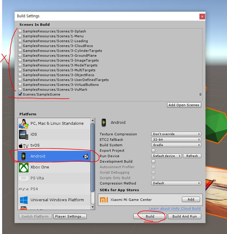 다른 씬들은 체크해제 후 현재 씬만 체크하고 안드로이드로 빌드 후 내 핸드폰에 설치하고 확인하자.