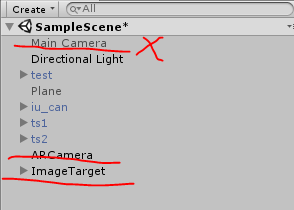 유니티에 메인카메라는 숨기거나 삭제하고 ARCamera를 새로 생성해준다.