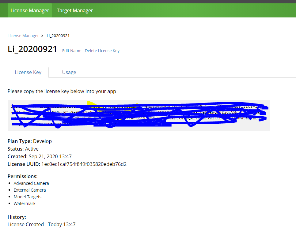 Assets -> Resources 폴더에 VuforiaConfiguration 파일이 있다. 여기에 라이센스키를 입력하자.
