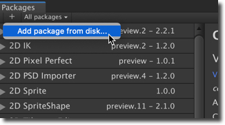 패키지 관리자의 왼쪽 상단에서 + (더하기) 버튼을 클릭합니다. 디스크에서 패키지 추가…를 선택합니다 .