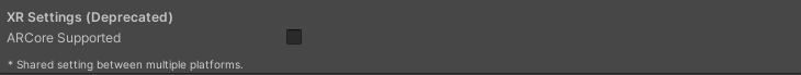 XR Settings -> ARCore Supported는 체크하지 않습니다.