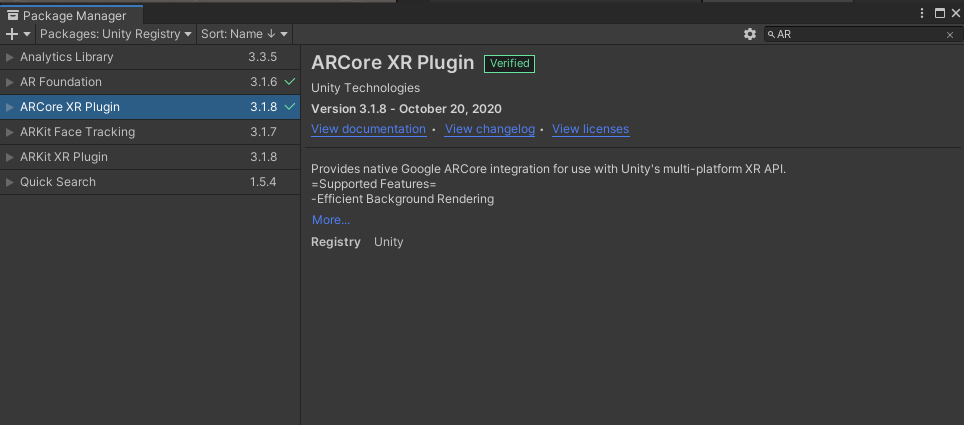 검색란에 AR을 검색하여 AR Foundation 과 ARCore XR Plugin을 설치해 줍니다.
