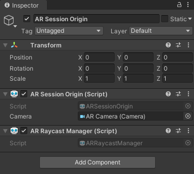 Hierarchy에 미리 생성해 놓은 AR Sessiohn Origin 객체에 AR RaycastManager 컴포넌트를 추가합니다.