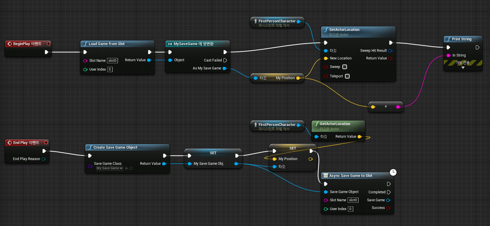 종료할때 캐릭터의 위치를 저장해서 시작할때 마지막 종료 위치에서 시작하게 설정 해 보았다.