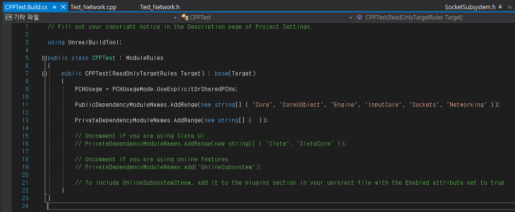 언리얼의 기능을 사용하고자 할때 헤더파일을 include 해야 합니다.